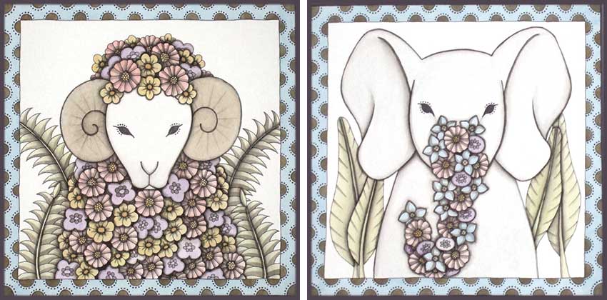 FlowerAnimalSeries Sheep&Elephant Flower Sheep (2008) 220×220 紙 墨 アクリル絵具 Flower Elephant (2008) 220×220 紙 墨 アクリル絵具